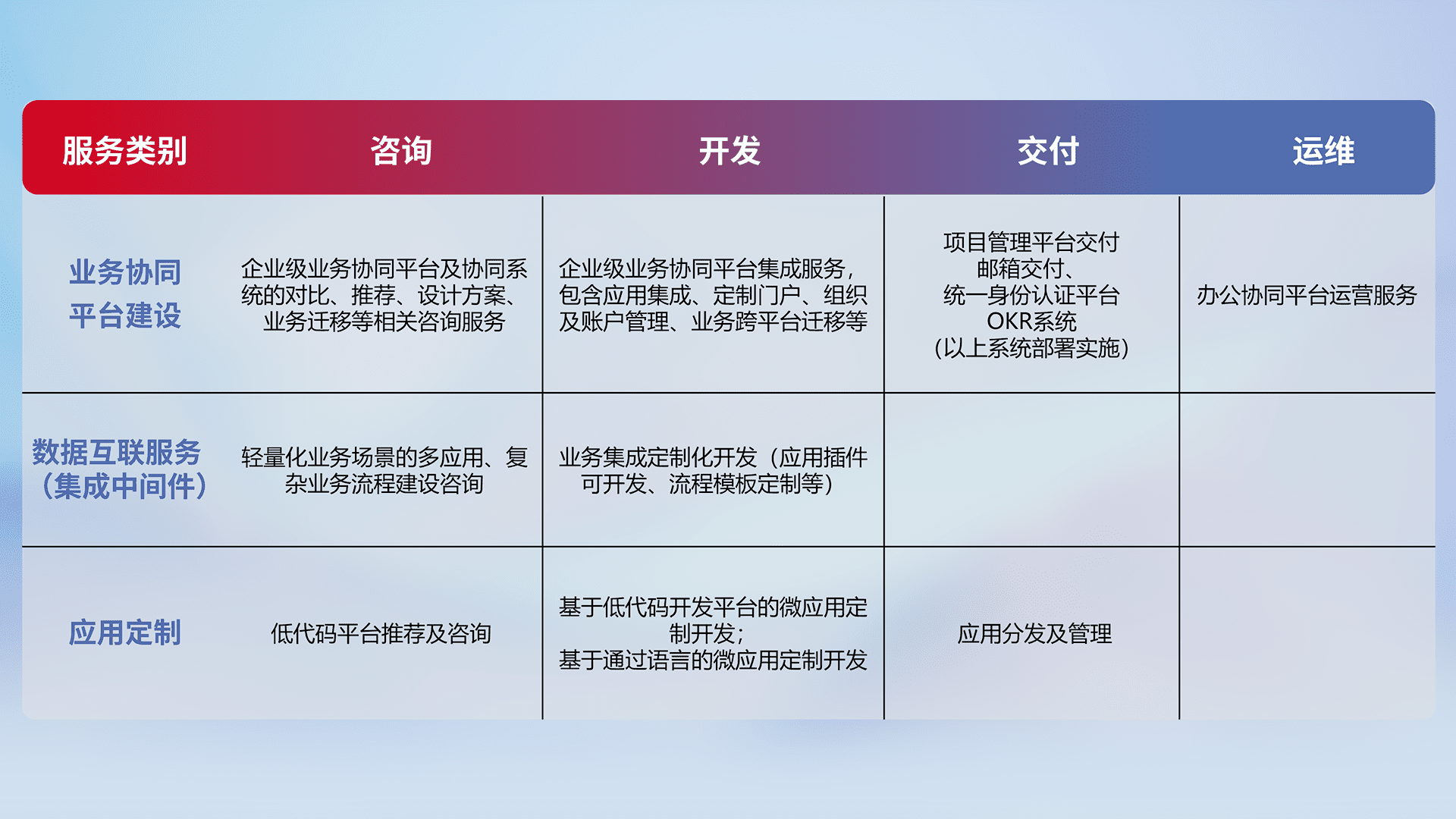 针对钉钉、、、企微、、IDaas等平台级产品提供产品的规划、、方案、、交付、、、、定制化开发等服务,,,,实现如统一协同办公、、、智能客户服务、、、、混合会议管理、、、、智能数据查询、、、等业务场景,,,实现数字化转型。。。。